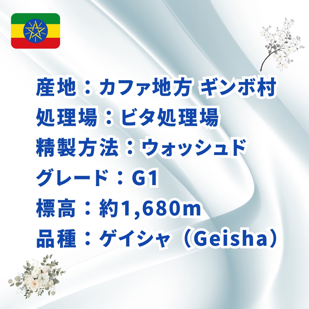 エチオピア南西部・カファ(Kaffa)地域 金宝村(Gimbo)で栽培されたゲイシャ品種を、ビタ処理場(Bita Station)にてウォッシュド精製したスペシャリティコーヒーです。