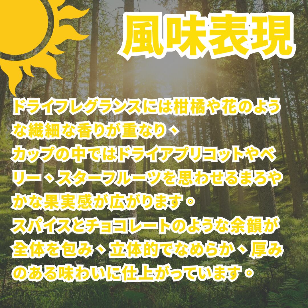 カップの中ではドライアプリコットやベリー、スターフルーツを思わせるまろやかな果実感が広がります。